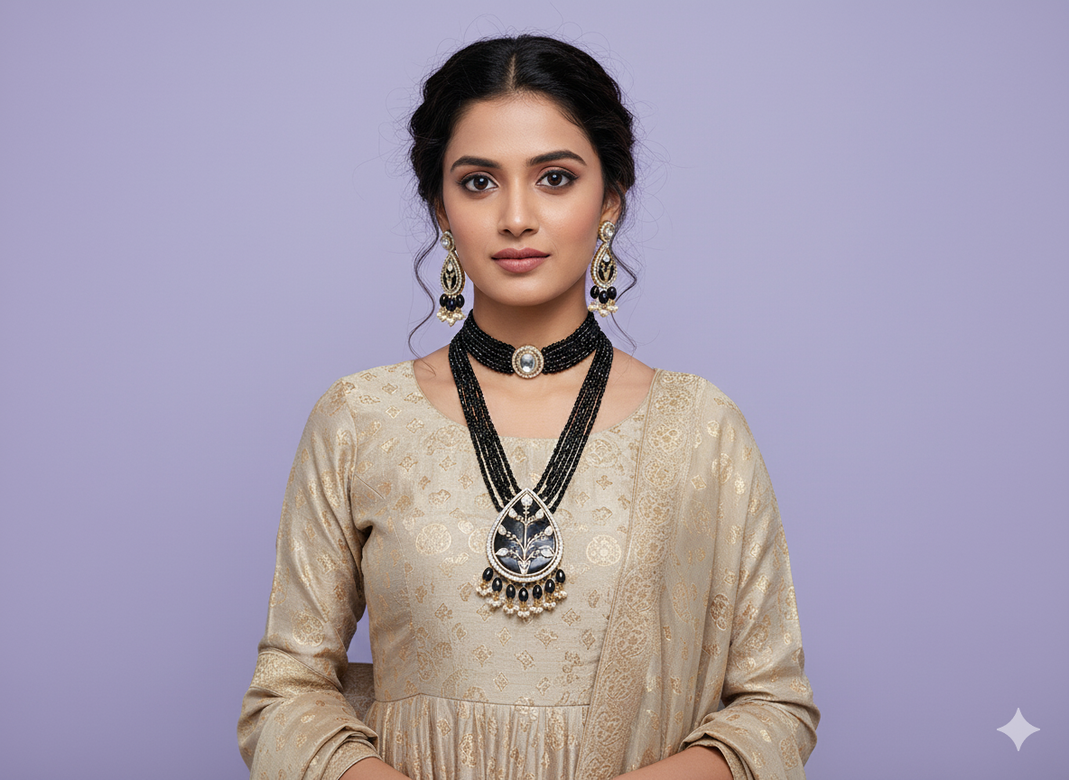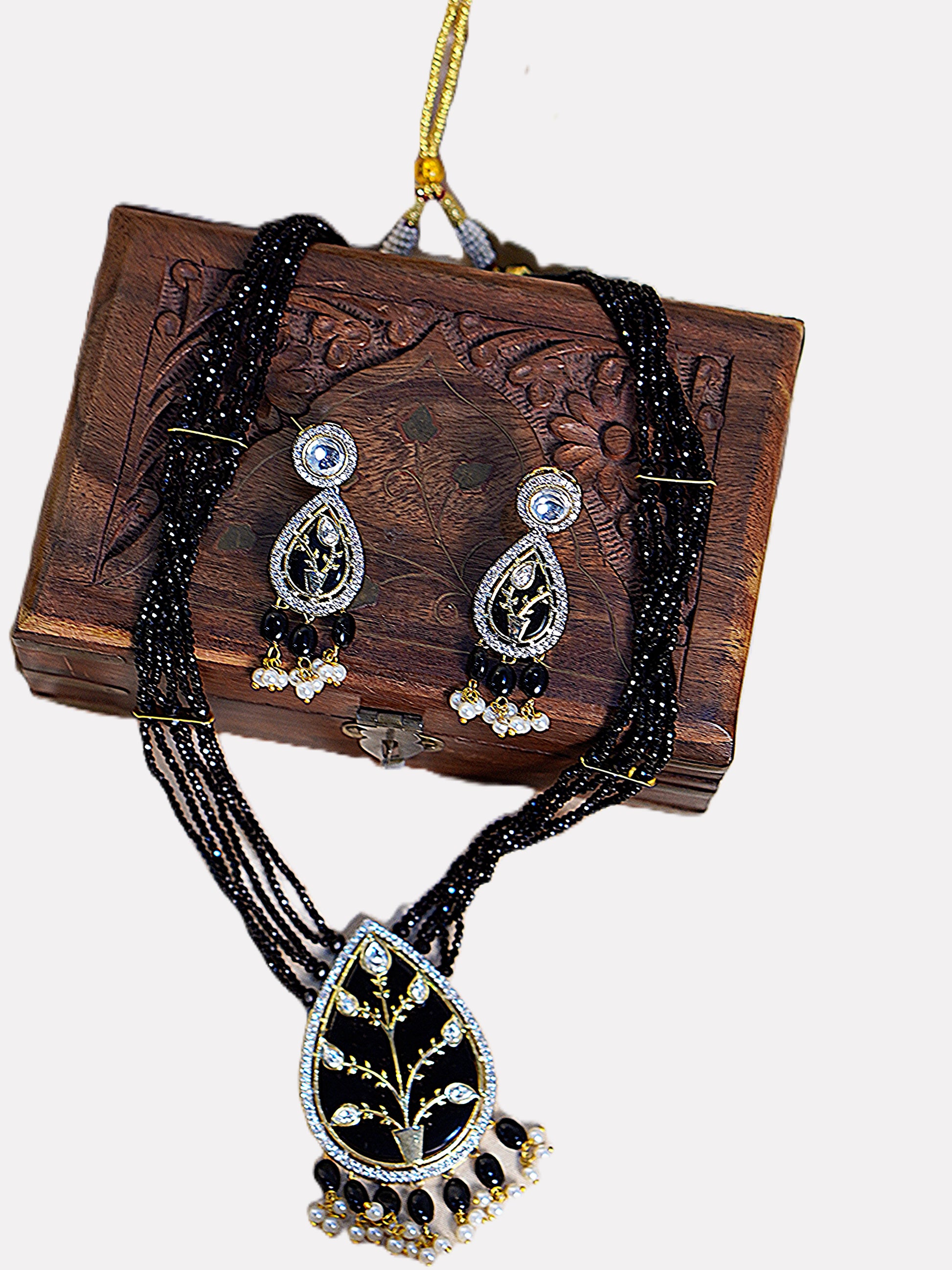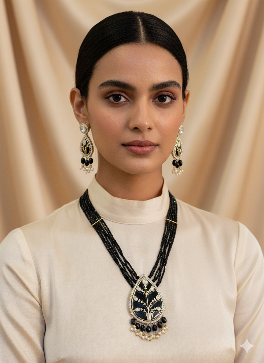 Product Description: -Elevate your ethnic collection with this exquisite Black Beaded Necklace Set with Matching Earrings. Featuring multiple strands of fine black beads, the set is a perfect blend of traditional elegance and modern sophistication. The centerpiece is a striking teardrop-shaped pendant adorned with intricate golden floral motifs on glossy black enamel, accentuated by shimmering white crystals and delicate pearl drops. The matching earrings mirror the pendant’s design, completing the ensemble.