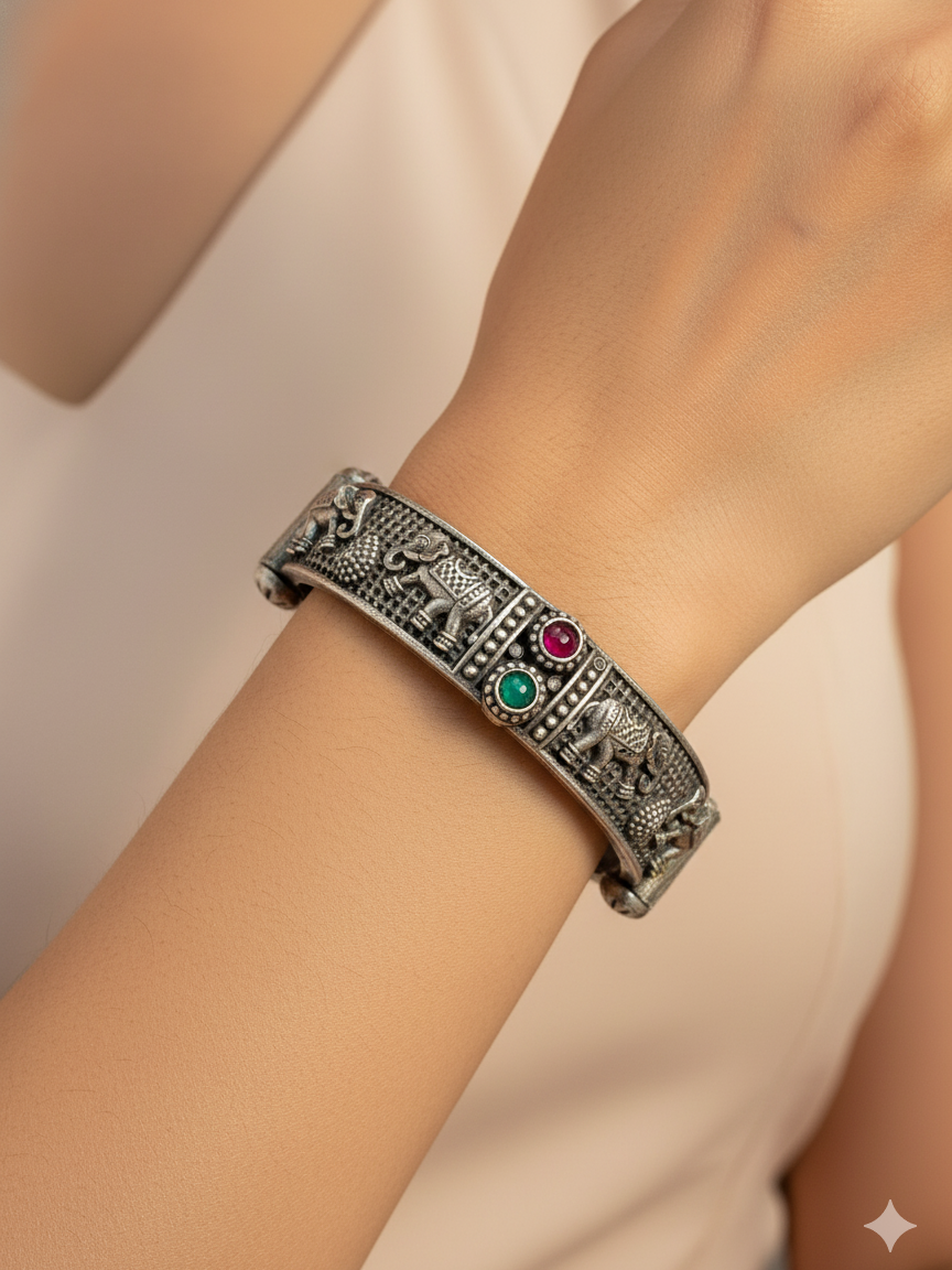 Celebrate tradition with these exquisitely crafted oxidized bangles featuring detailed elephant motifs and vibrant stone embellishments. Designed with a vintage tribal appeal, these bangles reflect heritage artistry and timeless style. The sturdy metal finish and antique texture make them a perfect accessory for festive wear or cultural events. Whether worn solo or stacked, these bangles add elegance and character to your ethnic ensemble.
