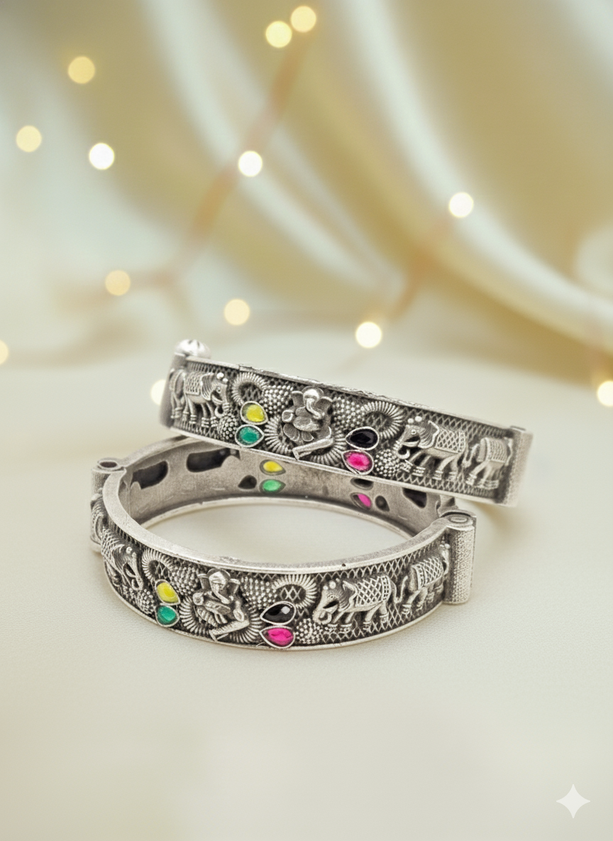 This exquisite, oxidized silver bangle is a beautiful fusion of traditional artistry and modern elegance. It features intricate carvings of elephants and floral motifs, symbolizing prosperity and grace. Accented with colorful enamel inlays in red, green, yellow, and black, this piece adds a vibrant yet sophisticated touch to any outfit. The detailed texture and raised designs reflect skilled craftsmanship, making it a standout accessory. Perfect for festive occasions, ethnic wear, or gifting, this bangle is both a style statement and a tribute to cultural heritage.