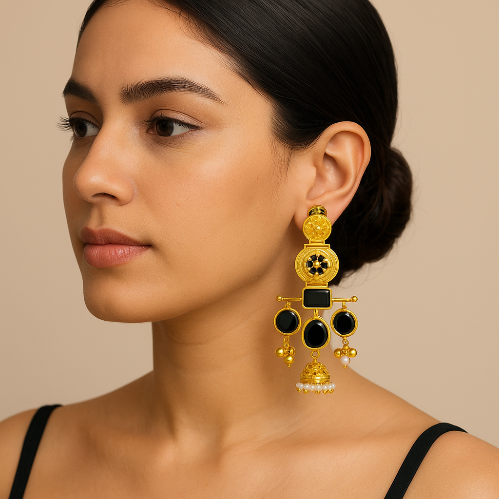 Radiate elegance with our Manikarnika Jhumka Earrings, a perfect blend of tradition and sophistication. Crafted with stones set in a rich gold-tone frame, these earrings exude a feminine charm and royal grace. The intricate detailing, delicate pearl drops, and gleaming golden finish make them a stunning choice for weddings, festive celebrations, or evening occasions. Designed to stand out, this pair beautifully complements both traditional and contemporary outfits.