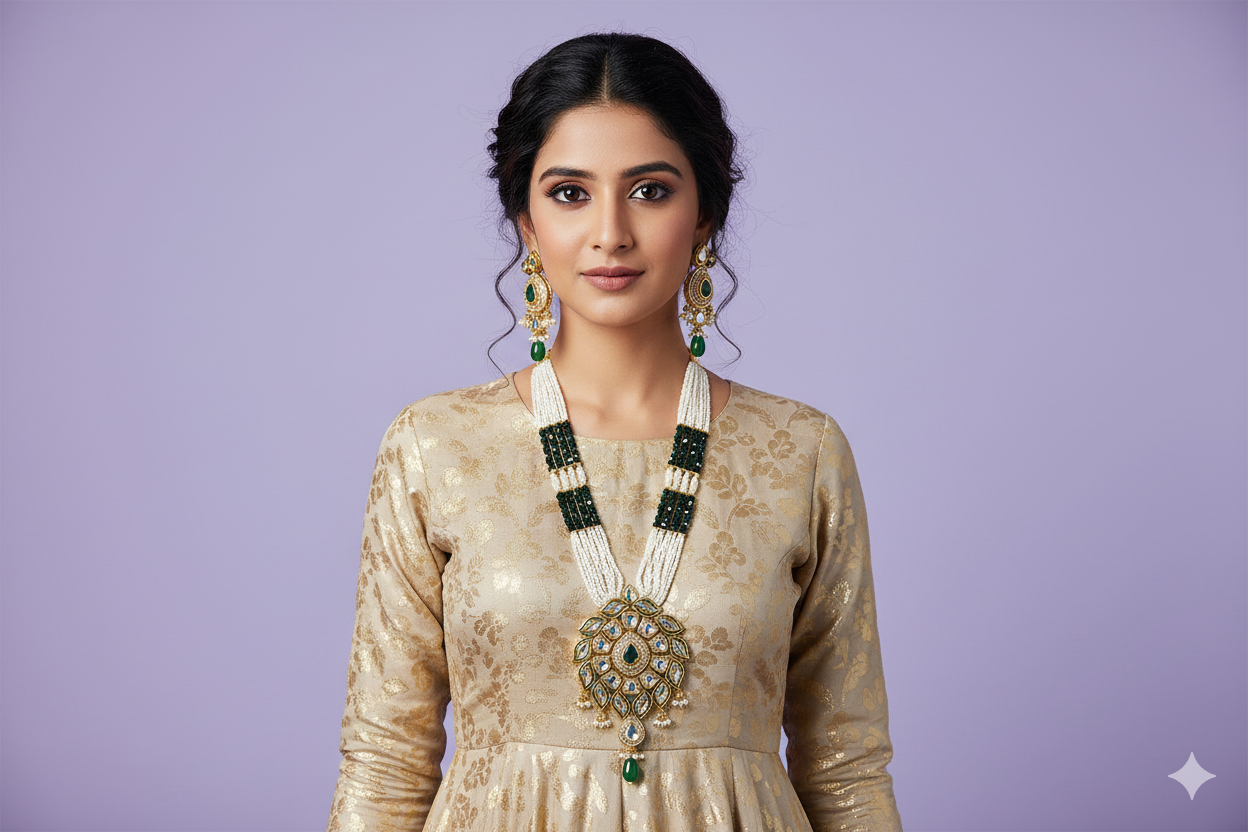 Matching Statement Earrings: Chandelier-style earrings with Kundan and pearl embellishments for a coordinated look
