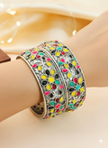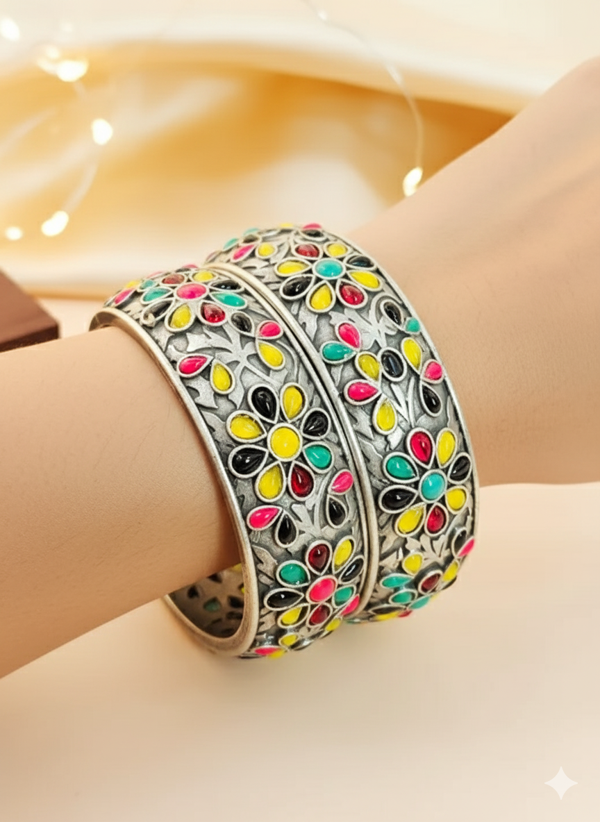 Add a vibrant touch of tradition to your jewelry collection with these exquisitely handcrafted oxidized bangles. Adorned with intricate floral patterns filled with vivid multicolor enamel, these bangles offer a perfect fusion of ethnic charm and modern flair. The oxidized silver finish gives them a timeless vintage appeal, while the secure clasp ensures a snug and comfortable fit. Ideal for festive occasions, cultural celebrations, or pairing with your favorite ethnic wear, these bangles are a versatile addition to your accessory wardrobe. Whether you're dressing up for a wedding or looking to elevate your everyday ethnic style, these bangles make a striking statement.
