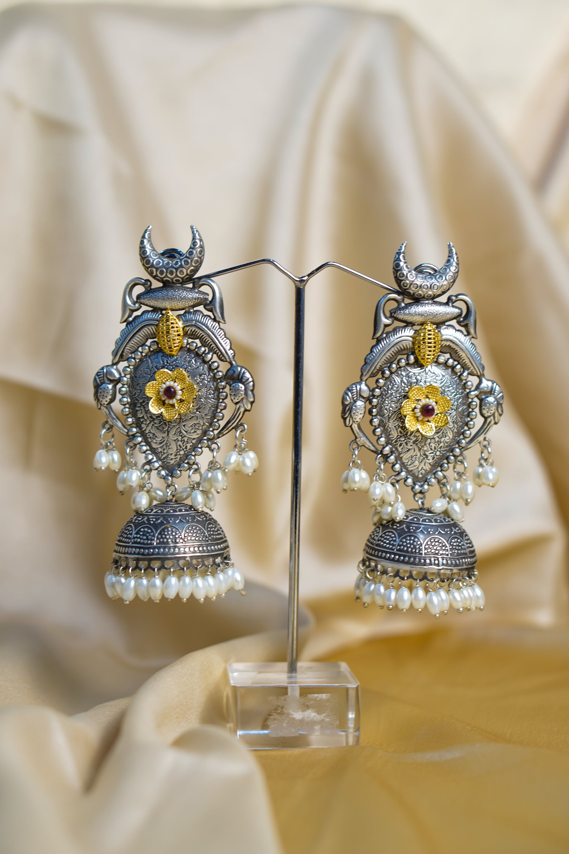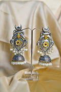 Embrace timeless tradition with these intricately handcrafted oxidized silver jhumka earrings. Designed with exquisite detailing, each earring features a crescent moon motif at the top, a floral centerpiece with golden accents, and delicate pearl drops that add grace and movement. The dome-shaped jhumka base is adorned with fine carvings, creating a perfect blend of heritage and artistry.