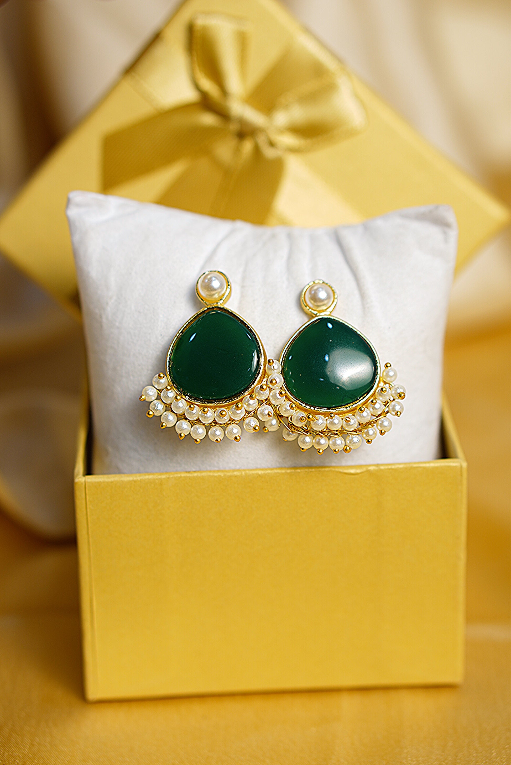 Add timeless elegance to your look with these exquisite earrings. Designed with a bold teardrop stone at the center, surrounded by delicate golden details and pearl accents, this piece strikes the perfect balance between tradition and modern sophistication. Lightweight yet striking, these earrings are ideal for festive celebrations, weddings, or evening parties—making you shine with every turn.
