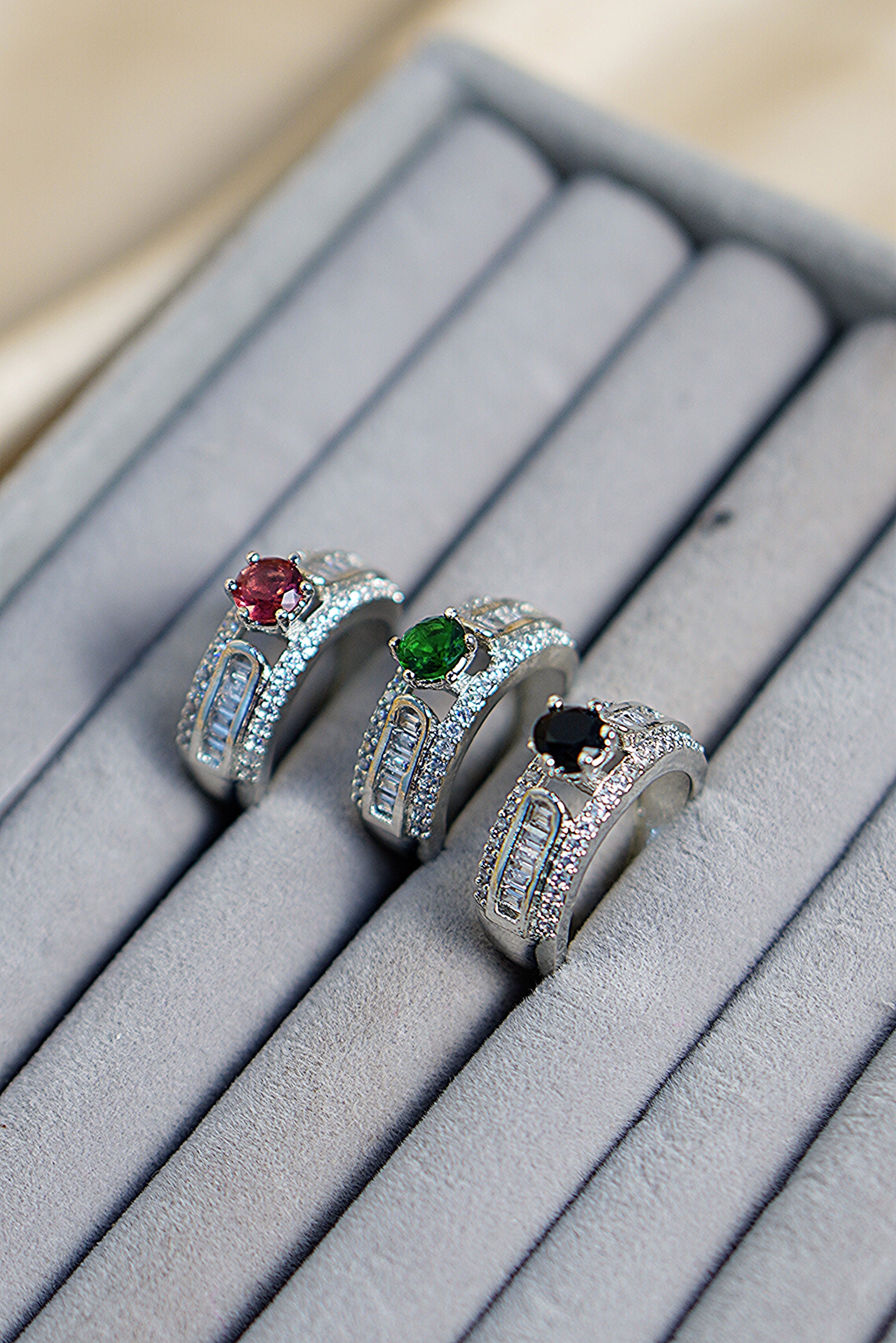 Make a bold statement with our statement Stone Ring, a timeless fusion of elegance and strength. Featuring a striking round gemstone at its center, this ring is framed with sparkling pavé-set stone and baguette-cut accents that exude luxury from every angle.