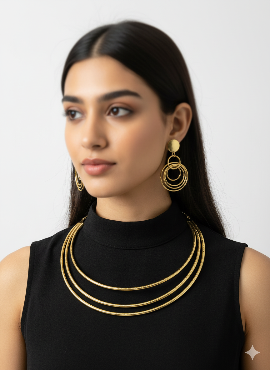 Majestic Design: Triple-layered textured hasli paired with artistic concentric earrings, symbolizing eternity and grace.